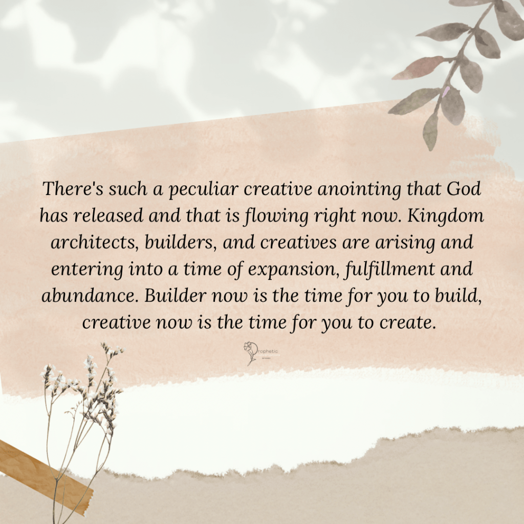 There’s such a peculiar creative anointing that God has released and that is flowing right now. Kingdom architects, builders, and creatives are arising. And because they build and create with the Holy Spirit and with integrity of heart, He is bringing them into a time of expansion, fulfillment and abundance. Builder, now is the time for you to build. Creative, now is the time for you to create.